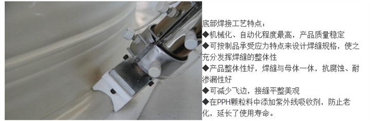 外部焊接就是用進口自動擠出焊接機組使儲罐應力大部位實現大焊縫一次焊接成型的工藝。將與罐體性質相同的全新PP、PPH顆粒料熱熔在大焊縫處,與罐底、罐體成一體。
